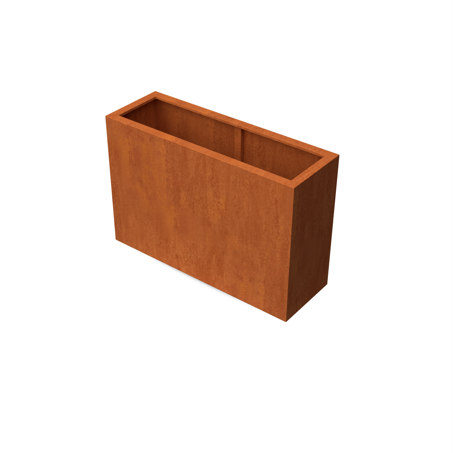 Pflanzgefäß Artesa Cortenstahl 1200x400x800mm (LxBxH) – Materialstärke 2mm. Ausgestattet mit Verstärkungsrohren auf der Innenseite. Ausgestattet mit einem Boden mit Entwässerungslöchern. Schenkel 15 mm hoch. Obere Kante 50 mm gefalzt.