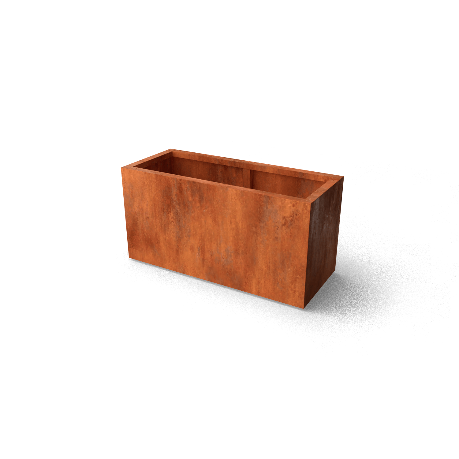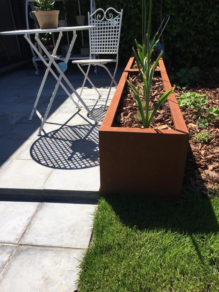 Pflanzgefäß Artesa Cortenstahl 1200x500x600mm (LxBxH) – Materialstärke 2mm. Ausgestattet mit Verstärkungsrohren auf der Innenseite. Ausgestattet mit einem Boden mit Entwässerungslöchern. Schenkel 15 mm hoch. Obere Kante 50 mm gefalzt.