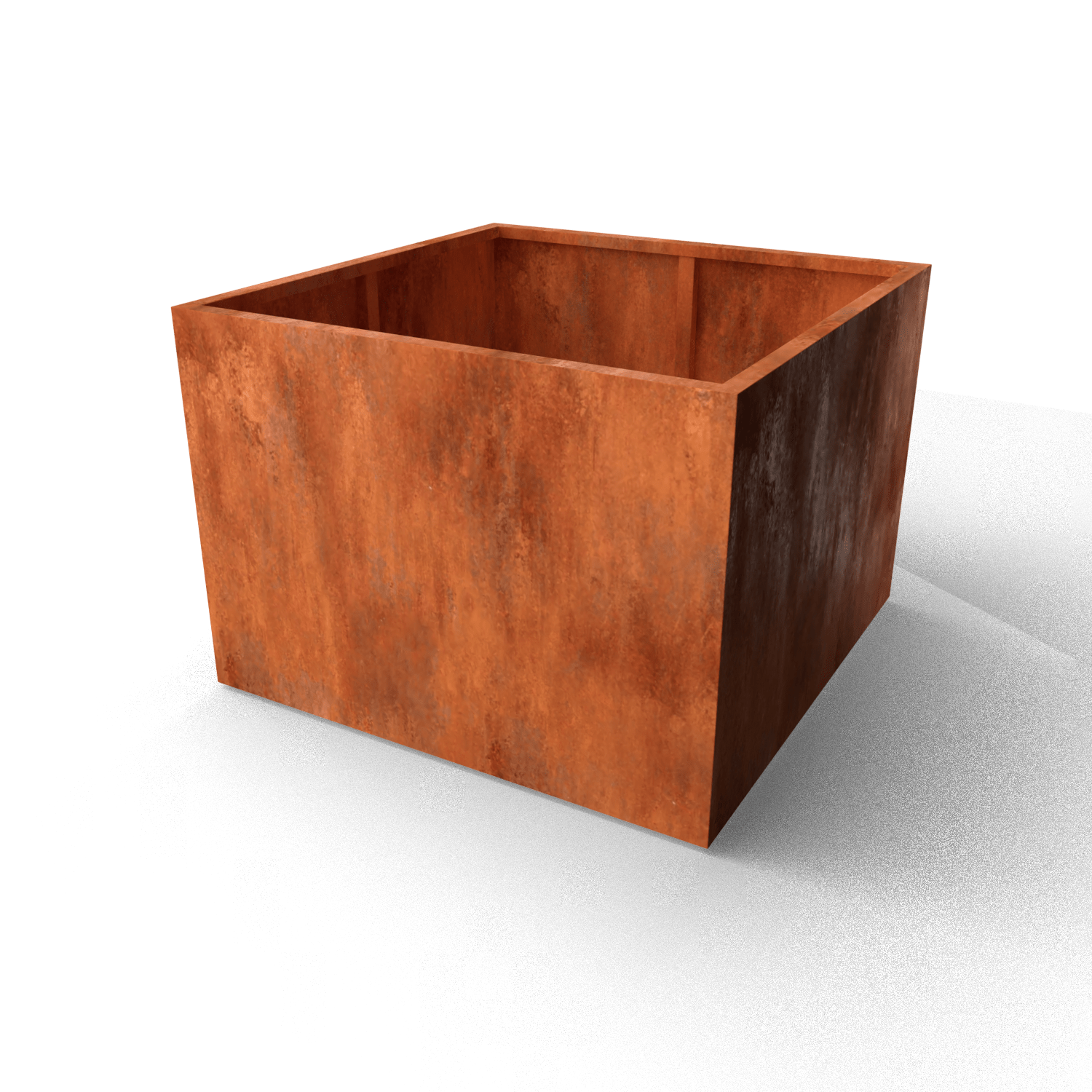 Pflanzgefäß Artesa Cortenstahl 1400x1400x800mm (LxBxH) – Materialstärke 2mm. Ausgestattet mit Verstärkungsrohren auf der Innenseite. Ausgestattet mit einem Boden mit Entwässerungslöchern. Schenkel 15 mm hoch. Obere Kante 50 mm gefalzt.