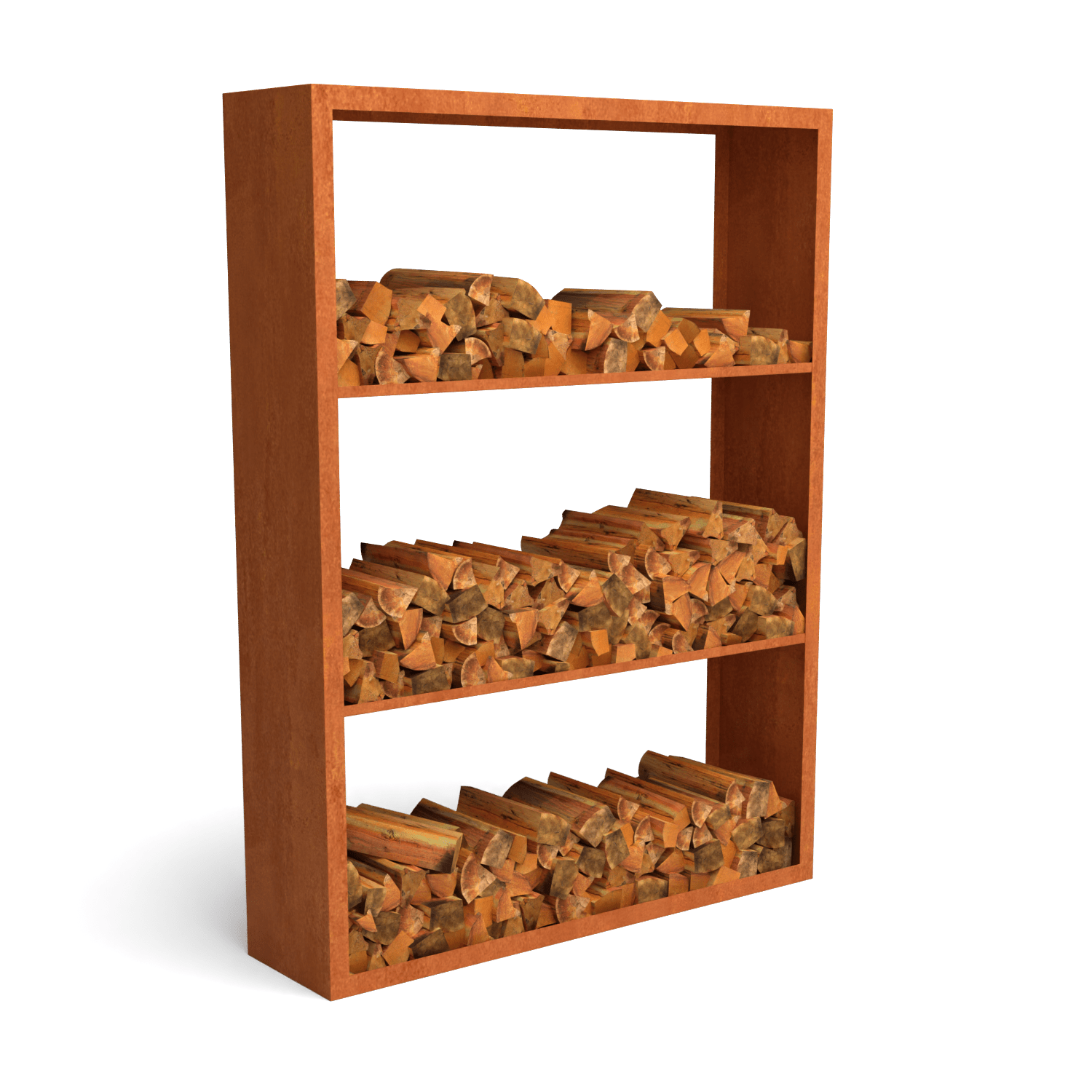 Egura Cortenstahl Holzlager – Unterteilung 3 Fächer – Länge: 1500 – Breite: 385 – Höhe: 2000