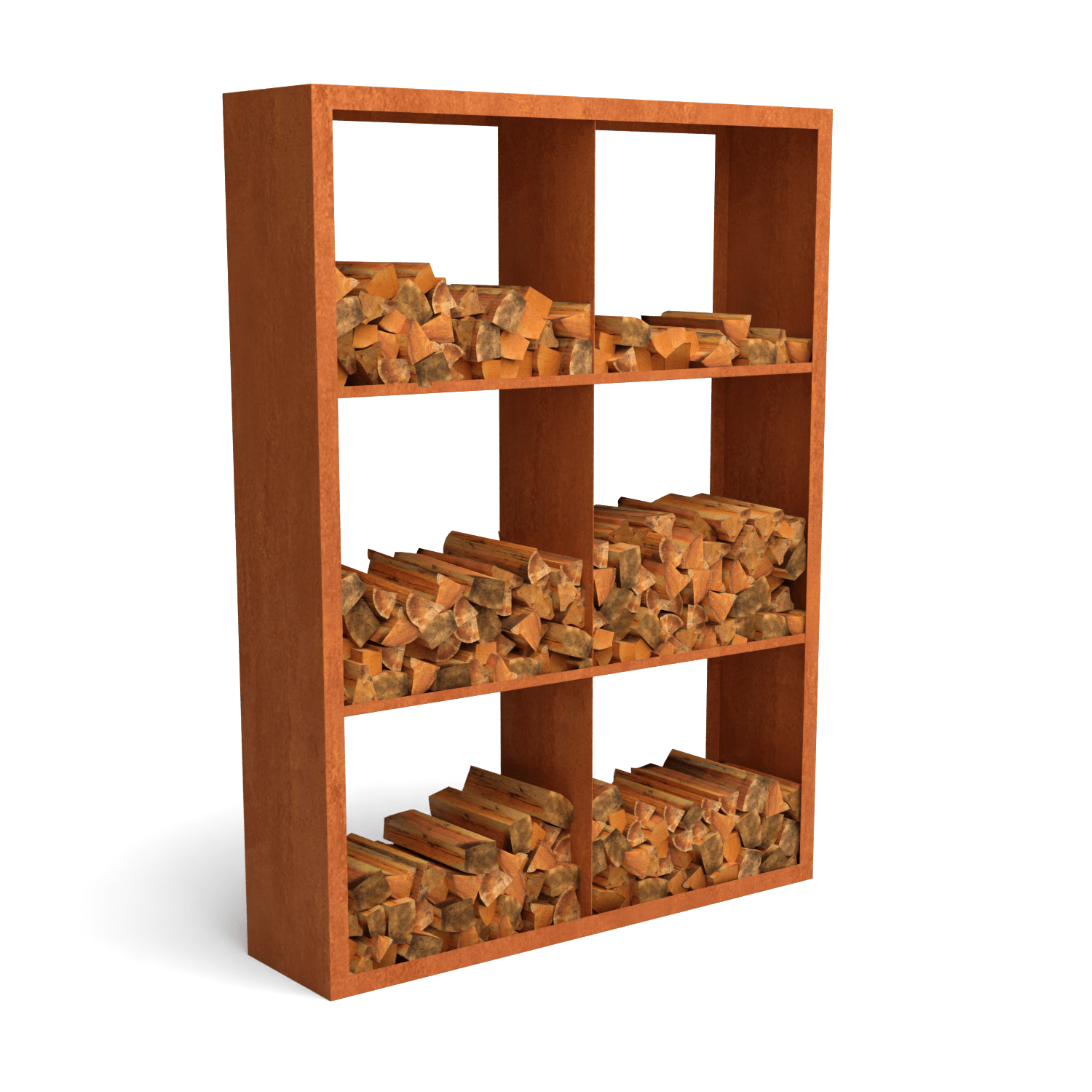 Egura Cortenstahl Holzlager – Unterteilung 6 Boxen – Länge: 1500 – Breite: 385 – Höhe: 2000