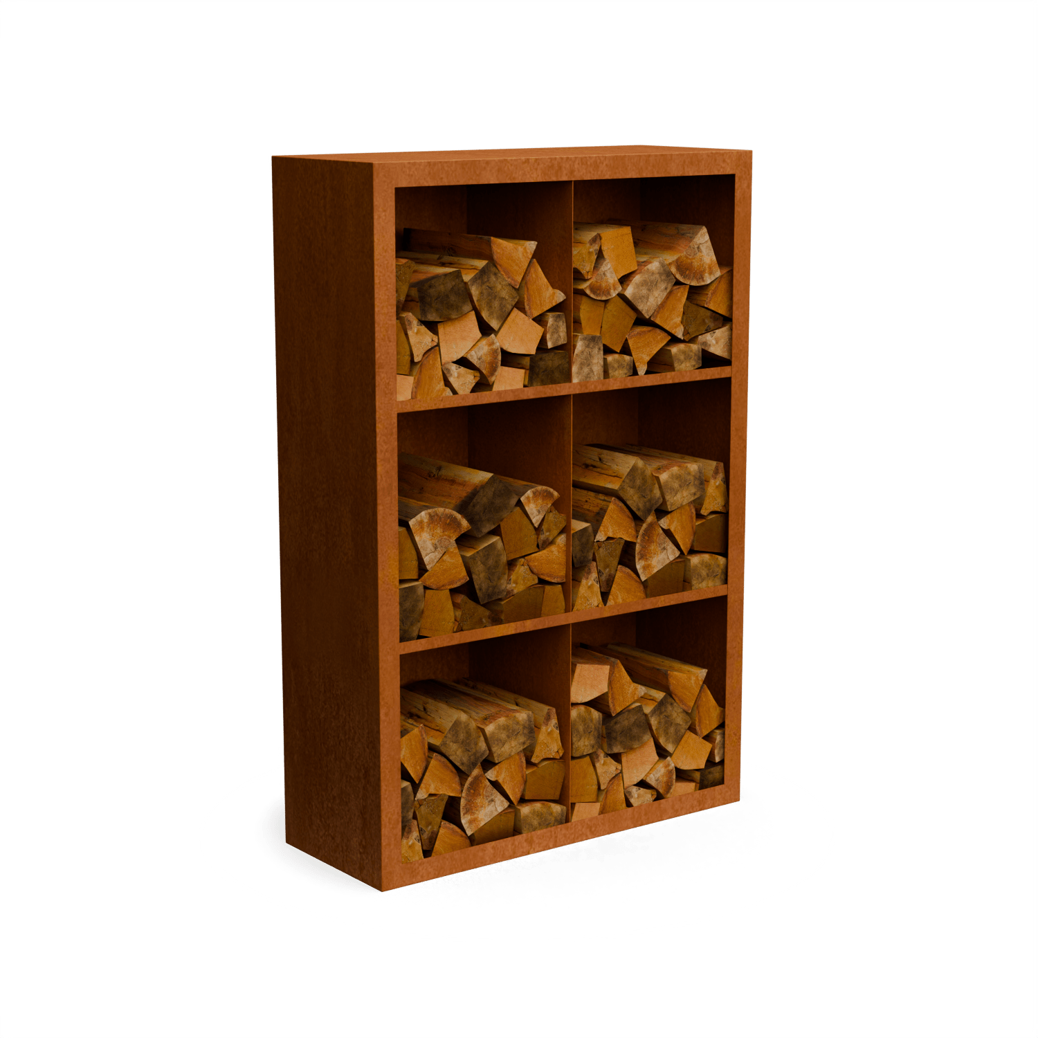 Egura Cortenstahl Holzlager – Unterteilung 6 Boxen mit rückwand- Länge: 1000 – Breite: 385 – Höhe: 1500