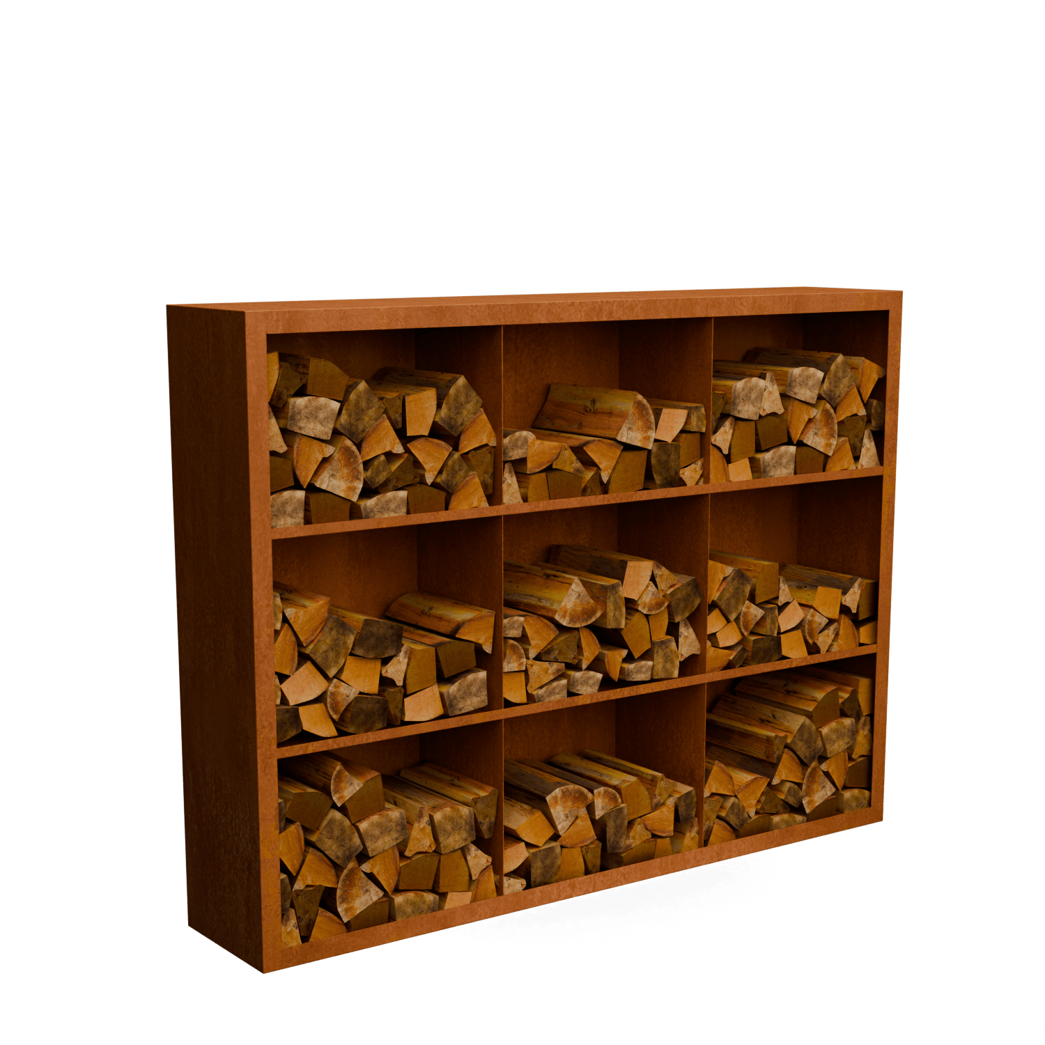 Egura Cortenstahl Holzlager – Unterteilung 9 Boxen mit rückwand – Länge: 2000 – Breite: 385 – Höhe: 1500