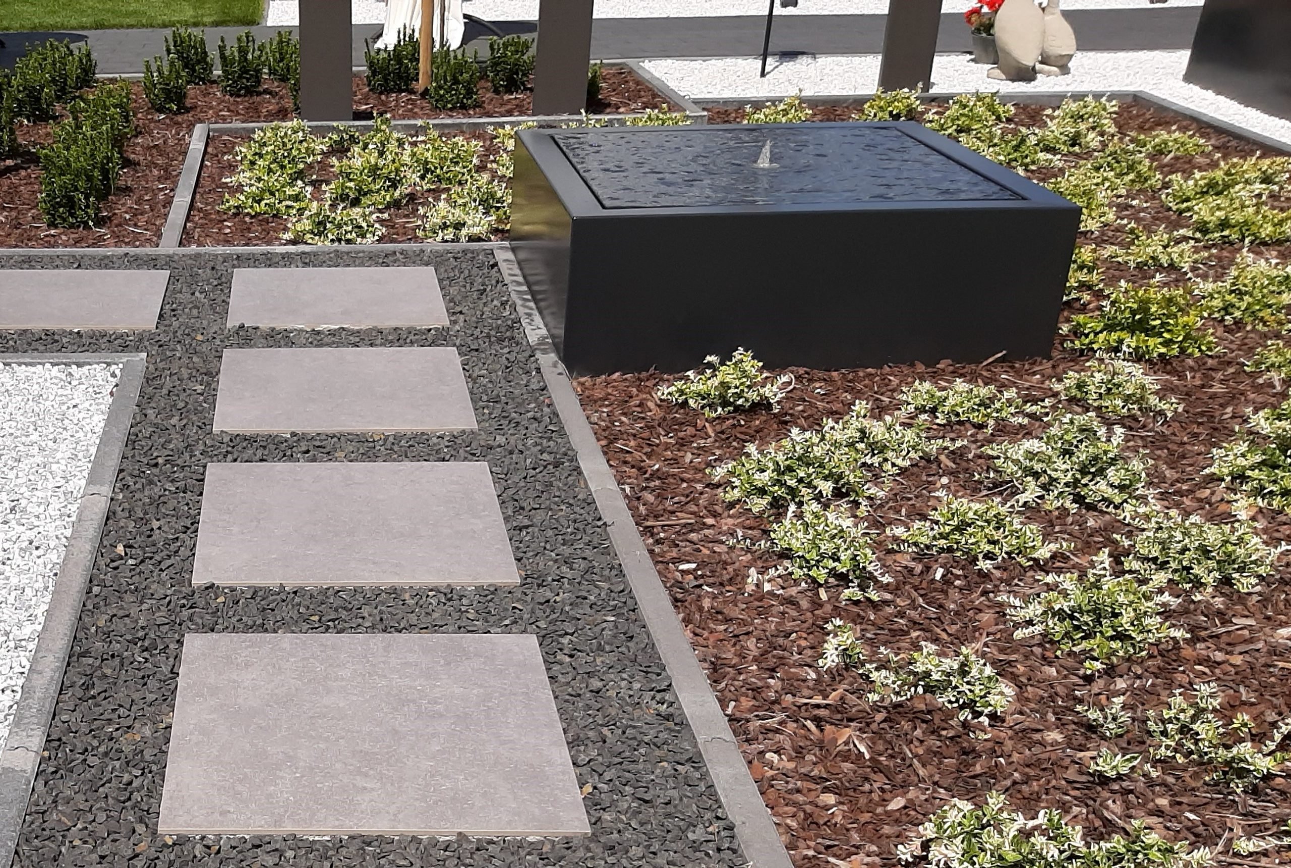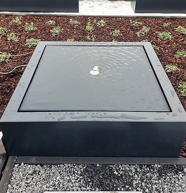 Taula Quadra quadratischer Wassertisch – Material: 3mm Aluminium in RAL-Farbe pulverbeschichtet – 1000x1000x400mm (L x B x H) – Ausgestattet mit 1 Oase Lunaled 9S LED Fontäne und Pumpe (Pondamax Eco 1500).